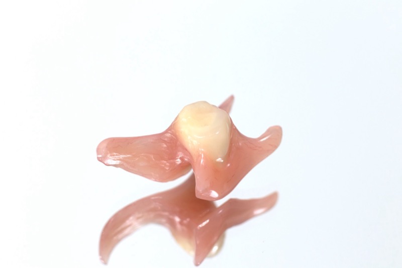金属の金具を用いないため、歯に金具が重なって見えてしまう審美障害がありません。ただ、痛くないしっかり咬めるノンクラスプデンチャーのためには、写真のように隣の歯の上に小さな金属を乗せる必要があり、わずかな金属色は避けられません。