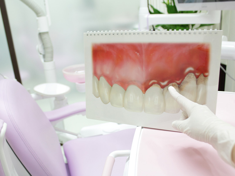 歯根表面に付着したプラークは、徐々に硬くなりセルフケアでは取れなくなってしまいます。また、歯石も同様にセルフケアでは除去することができません。歯周病はセルフケアで取り残し付着し続けたプラークによって発症するため、歯科医院で行うプロフェッショナルケアで完全に除去する必要があります。